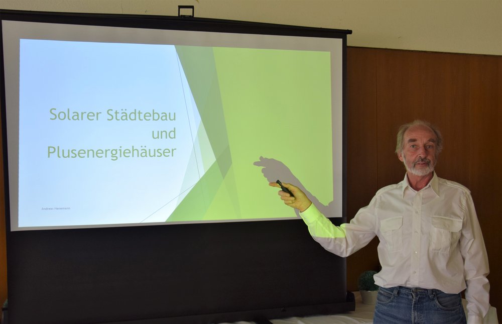 Anhand vieler Beispiele erläuterte Henemann auch die komplexen Zusammenhänge der Planung und Realisierung von Solar- bzw. Plusenergiehäusern. Dabei ist eine hoch wärmegedämmte Außenhülle der Gebäude sowie eine temperaturhierarchische Zonierung der Räume von großer Bedeutung für die Energiebilanz. Ebenso wichtig sind richtig dimensionierte und energetisch optimal ausgerichtete Fensterflächen für die passive Solarenergienutzung in der kalten Jahreszeit. Aktiv kann die Sonnenenergie außerdem zur Wärme- und Stromerzeugung genutzt werden mit Solarthermieanlagen, Wärmepumpen sowie Photovoltaikanlagen. Derartig konzipierte Solar- bzw. Plusenergiehäuser können durch die auf ihre Außenhülle treffende Sonnenstrahlung im Jahresmittel nicht nur den eigenen Strom- und Wärmebedarf decken, sondern zudem noch Strom in das öffentliche Netz einspeisen. Dies ist eine von wenigen Möglichkeiten in städtischen Bereichen mit erneuerbaren Energien zur schadstofffreien Strom- und Wärmeversorgung, also zum Klimaschutz, beizutragen.