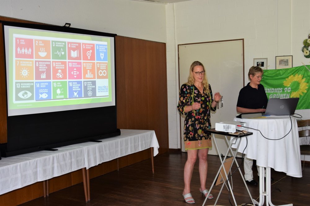 Unter diesem Thema stand eine sehr informative Veranstaltung der Artland-Grünen im Schützenhof Quakenbrück mit den Referentinnen Anna Kebschull und Maria Entrup-Henemann. Letztere erläuterte den zahlreichen Interessierten zunächst, wie der Begriff der Nachhaltigkeit seit den 60’er Jahren Eingang in zivilgesellschaftliche, wissenschaftliche und politische Handlungsfelder gefunden hat und sich von zunächst rein ressourcenschonender Interpretation („Die Grenzen des Wachstums“, 1972) weiterentwickelte zu einem Leitkonzept, das heute mit den drei Säulen Ökologie, Ökonomie und Soziales alle Politikfelder verbindet. Die Vereinten Nationen verbanden in der Agenda 2030 von 2015 dieses Konzept mit 17 konkreten Nachhaltigkeitszielen (Sustainable Development Goals = SDG’s), die von der Deutschen Nachhaltigkeitsstrategie übernommen wurden. Zur Erreichung dieser Ziele wurde von den politischen Gremien unter Beteiligung der kommunalen Spitzenverbände Indikatoren entwickelt, die messbar machen sollen, wie weit Kommunen diese Nachhaltigkeitsziele erreicht haben bzw. wo Maßnahmen erforderlich sind. Sofern diese Werte statistisch erfasst werden (das System steht noch im Aufbau), sind sie auch abrufbar, so auch für den Landkreis Osnabrück.